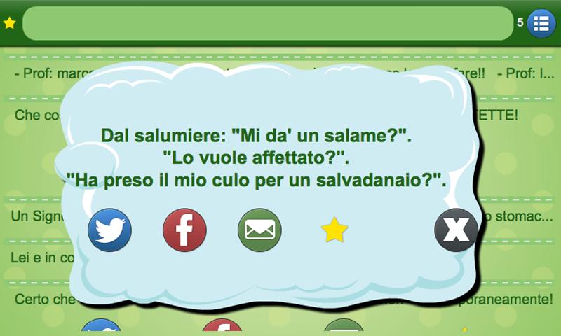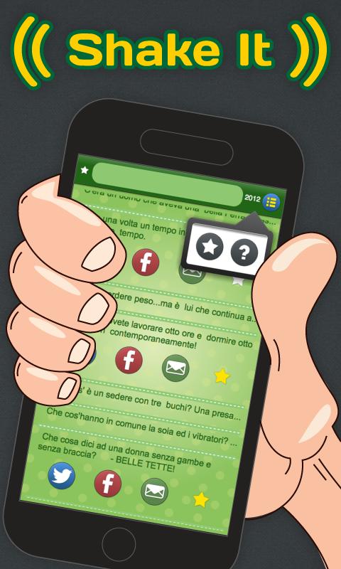 이탈리아 Scherzi e Barzellette 이라고 불리는이 2,000 명 이상의 거대한 세트는 휴대 전화에서 출시 된 가장 큰 컬렉션이어야합니다! 홍수를 "좋아하는"것으로 표시하고 텍스트로 필터를 필터링 할 수 있습니다. 응용 프로그램은 편의를 위해 슬라이딩 세션 사이의 위치를 포함하여 설정을 회상합니다. 응용 프로그램은 "업그레이드"인 App 구매 공지가 사라지고 Twitter, Facebook의 Lazzo를 공유하거나 주소로 게시 할 수 있습니다.