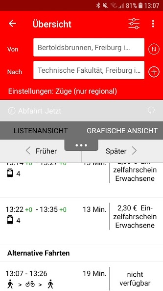 개별 조정 옵션, 예를 들어 달리기 속도 및 선호하는 운송 수단. 연결 개요는 목록과 그래픽으로 표시 될 수 있습니다. 이것은 항상 귀하의 요구에 맞는 연결 권장 사항을 제공합니다.