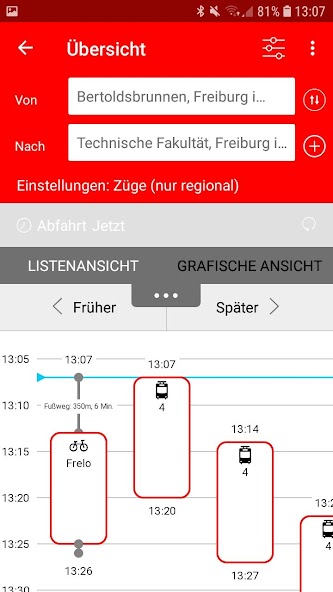 실시간 정보는 많은 열차, 버스 및 경전철 차량뿐만 아니라 자전거 렌탈 시스템 Frelo에도 사용할 수 있습니다. 따라서 여행이 제 시간에 시작 되든 현재 원하는 스테이션의 임대 자전거를 이용할 수 있거나 대체 연결을 자발적으로 선택할 수 있습니다. Freiburger verkehrs ag와의 연결의 경우 차량에 장벽이없는 경우 표시됩니다.
