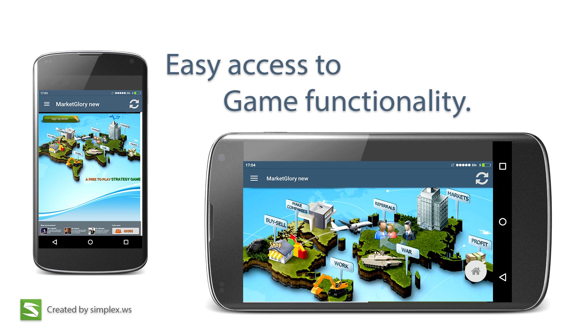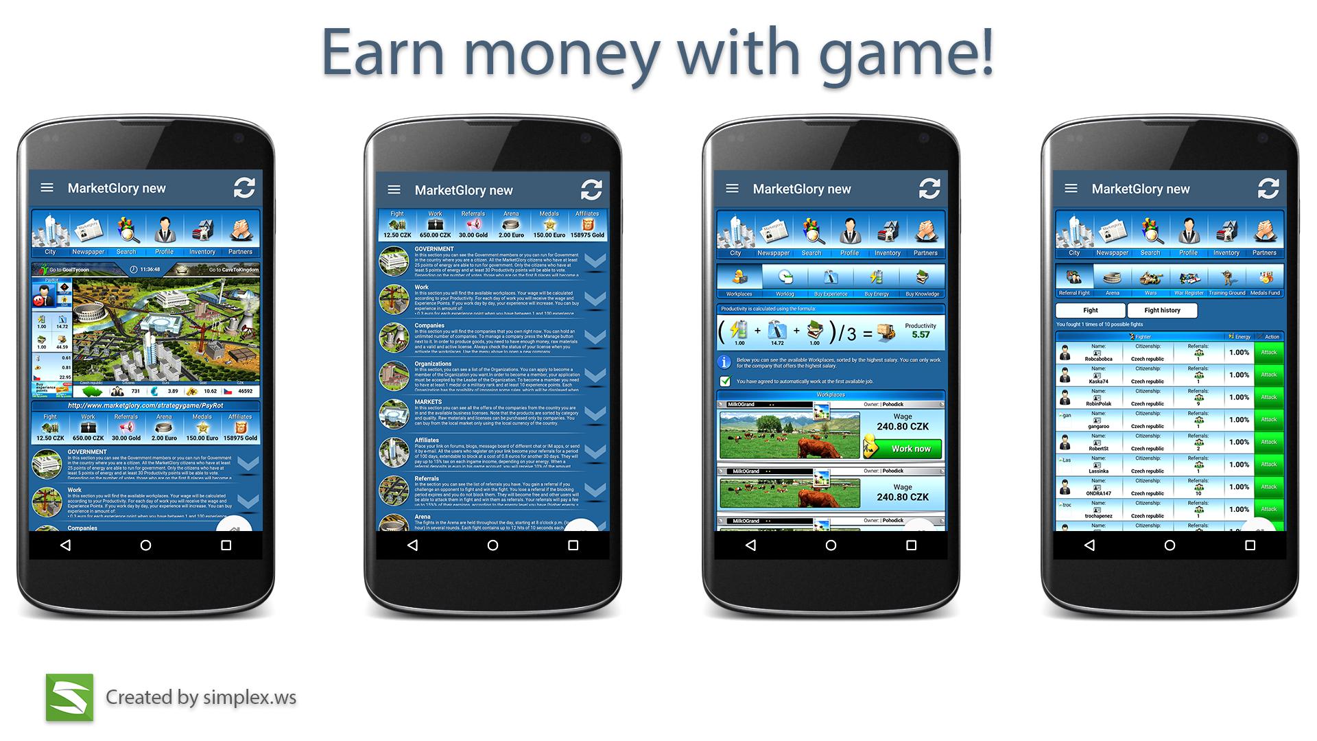 MarketGlory is a mass online browser game in which all the virtual currecy can be exchanged into real money.It is an economic, political, social and military simulator where you can use your local currency into your benefit. Each player from the MarketGlory community has the opportunity to: work, set up companies, run for the government, recommend referrals, gain military ranks and build their own organization.