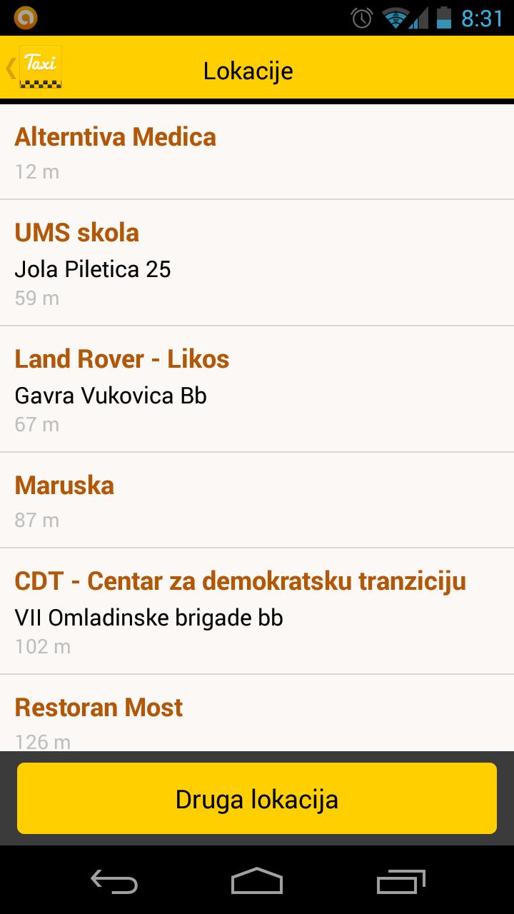 All locations shown in the application are downloaded from the Foursquare and serve to automated SMS creation when sending requests. There is also the ability to create your "Address Book" location within the Taxi Application, which you can save for further use.