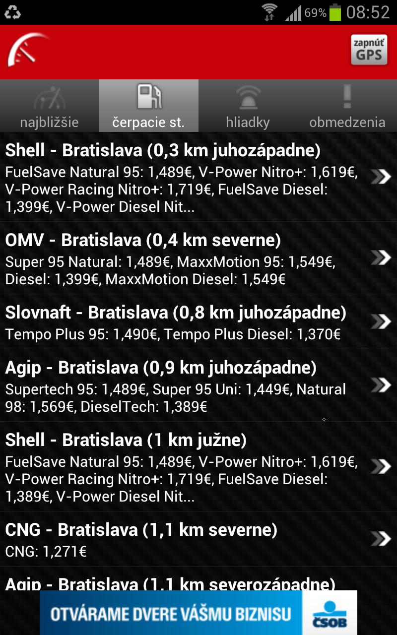 Natankuj.sk brings you to your phone prices of fuel, traffic restrictions and radars. You will have an overview of petrol stations near you with the prices of fuel offered, information on traffic restrictions or police patrols near you. At the same time there is a GPS tachometer in the application.