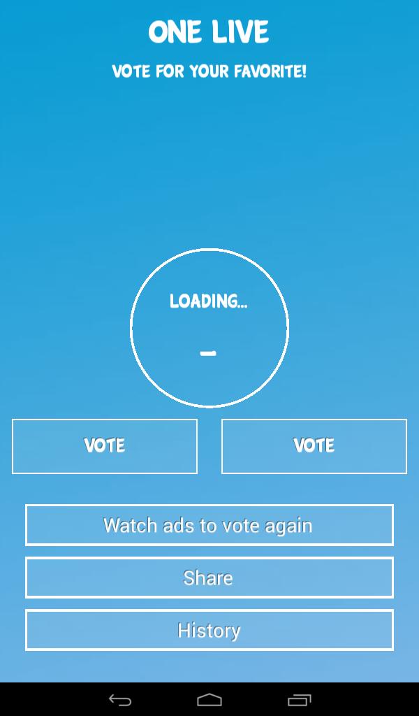 One live is a comparative application of everything with a fun style in which you will get to vote for favorites like:Fc Barcelona, Galaxy s6, iphone 6 more, one Xbox, PS4, FIFA 2015, PES 2015, Adidas, Nike, Samsung,Trivia crack, Trivia pursuit etc... In order for your favorites to have victory, and for you to show your fanaticism, you need to download this app and send your votes as soon as possible.