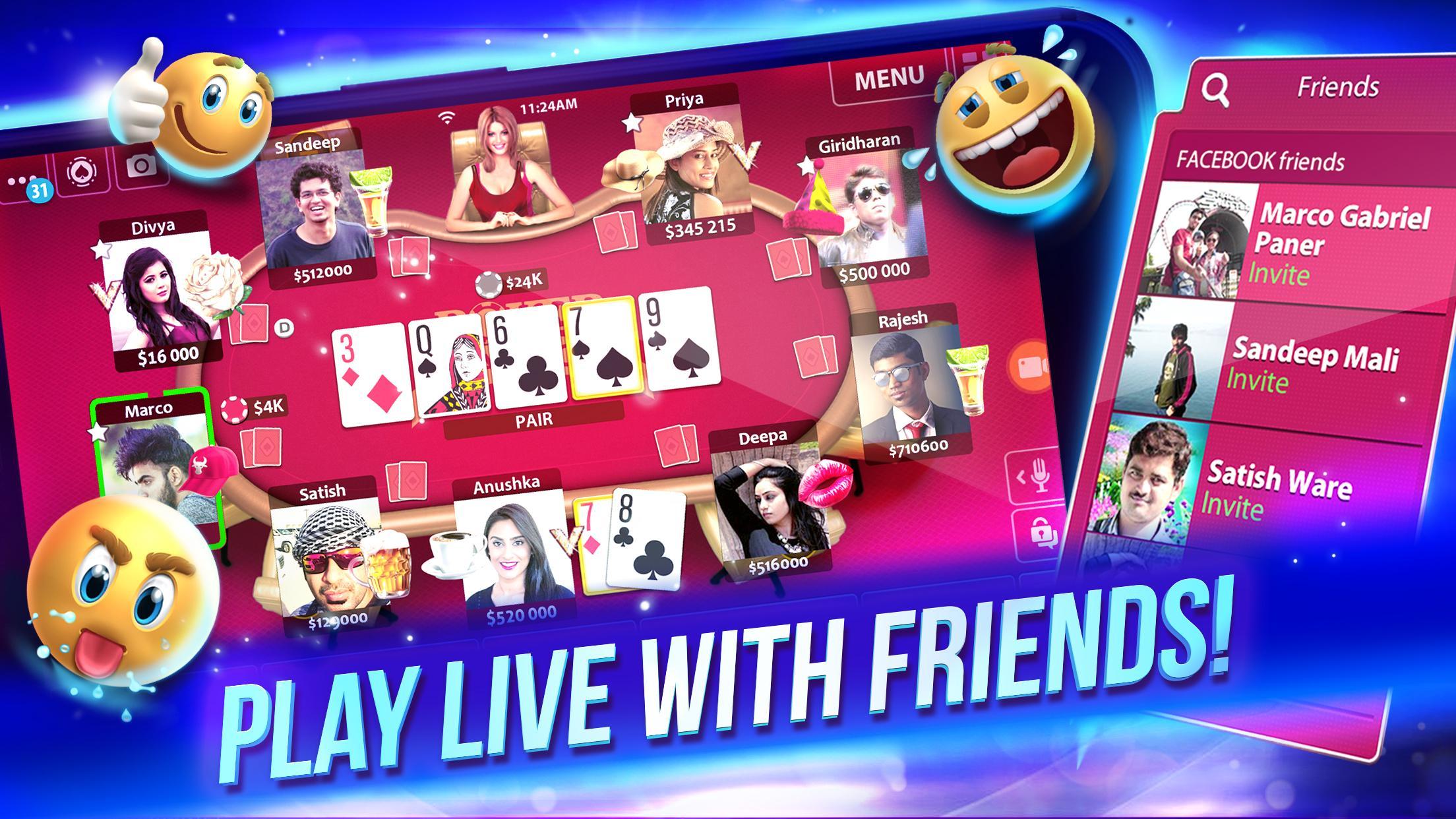 - Live Poker with Friends: Invite your poker friends via Facebook to play Poker Champions and get free chips. Make it a poker night with poker friends anytime, anywhere!