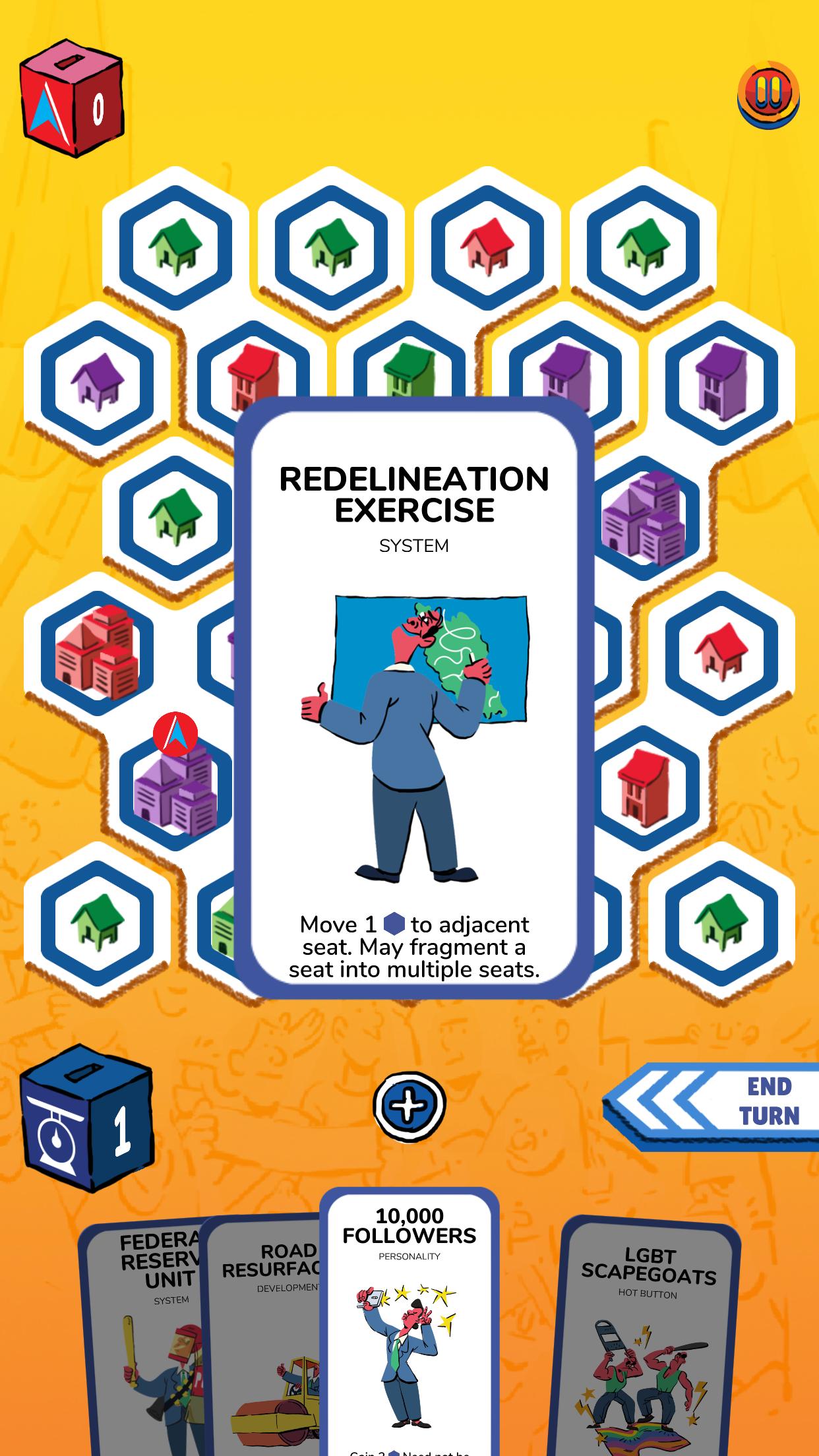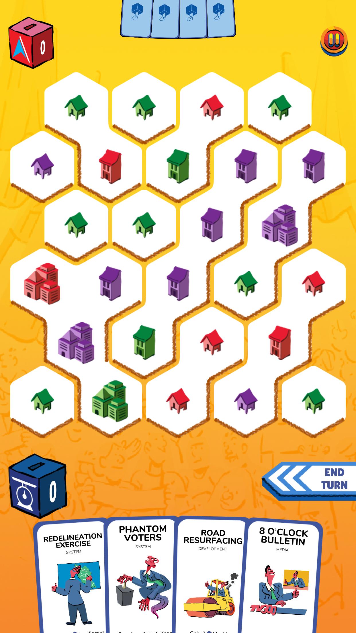 * Hex-map simulates the political landscape. Choose which seats to win or lose wisely!