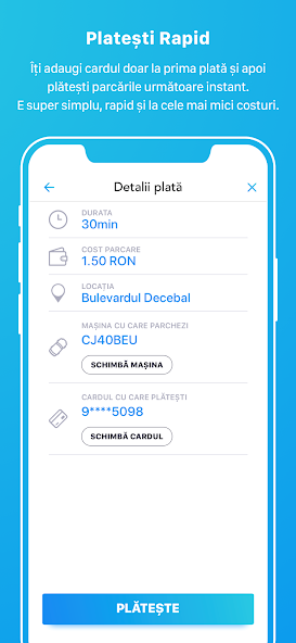 Add your card only for the first payment, and then instantly pay for subsequent parking. You can purchase credits directly from the app or through SelfPay payment stations, to use them for parking payment. The value of one credit is 1 RON. It's super easy and fast.