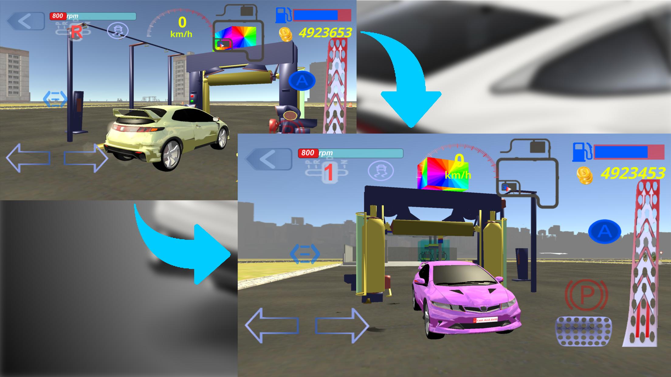 Ao tocar no centro da tela com um dedo, você pode girar a câmera ao redor do carro em um eixo vertical e horizontal e, com dois dedos, você pode fazer a câmera seguir o carro por trás. Você pode escolher câmeras diferentes e gostar de dirigir prazer em diferentes ângulos.
