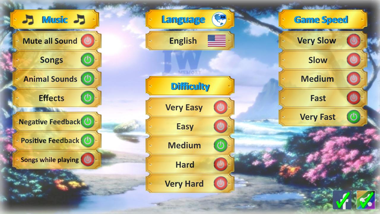 JW MEMORY é particularmente um bom jogo para crianças. O aplicativo promove o desenvolvimento intelectual e a memória. O princípio do jogo é simples, as cartas ocultas devem ficar com a face para cima, se forem da mesma imagem, o jogador vence o par.