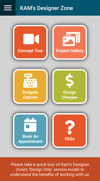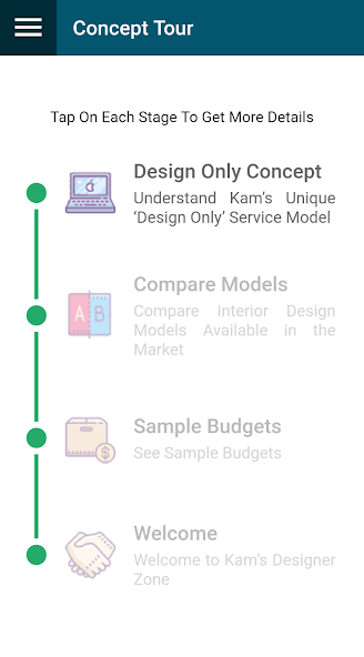 Estamos apresentando a fase 1 do aplicativo da Kams Designer Zone exclusivamente para novos clientes para dar uma compreensão completa do mercado de design de interiores. Isso ajudará você a fazer escolhas certas durante vários estágios enquanto você está projetando seu interior em casa.