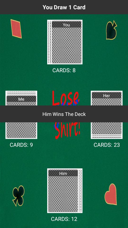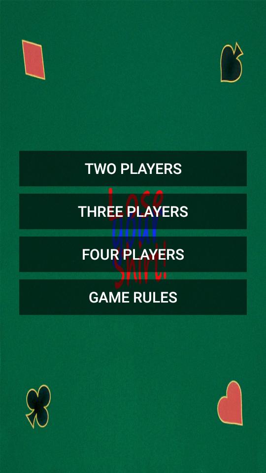 Esse jogo infantil popular também é conhecido como mendigo, meu vizinho, vence seu vizinho, fora de portas ou impostos. Em Trinidad, Barbados e talvez outras ilhas do Caribe, é conhecido como chupar o poço, e em francês às vezes é chamado de Bataille Corse (Batalha Corsicana). Outros nomes para ele são a guerra egípcia ou o assassino de ratos egípcios e assim por diante, seu sucesso na Lose Your Shirt depende da sorte do empate; Se você receber um bom punhado de cartões judiciais, provavelmente vencerá. Se alguém se sentir mal porque perdeu, você pode lembrá -lo disso. Mas isso não significa que você não pode parabenizá -lo se ele vencer!