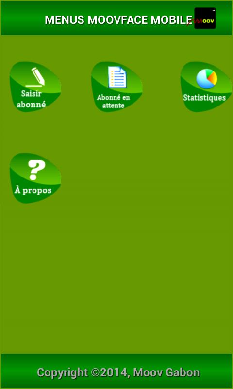 Moovface Mobile é um aplicativo Android do Moov Gabão. Ele oferece a possibilidade de qualquer titular de um smartphone Android (versão do OS superior ou Egle em 3.0) para identificar um assinante do operador de telefonia móvel Moov Gabão. Esta conta permitirá que o MOOV conte o número de assinantes que você identificou. Você também pode obter o número de assinantes que identificou no aplicativo. Observe também que qualquer assinante, com um número MOOV móvel não identificado, pode baixar o aplicativo e se identificar. Com Moovface Mobile , Moov Gabão se compromete a facilitar a identificação de seus assinantes.