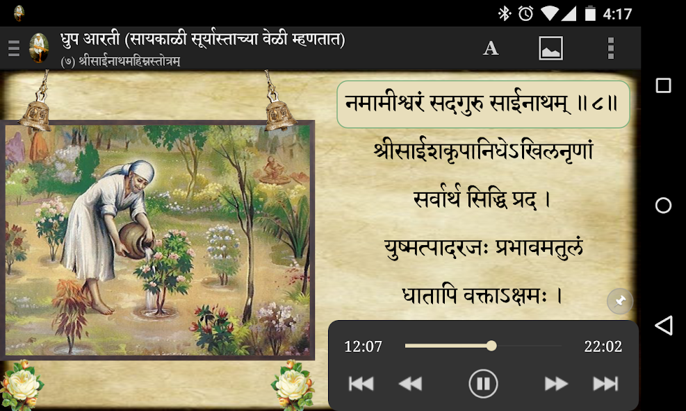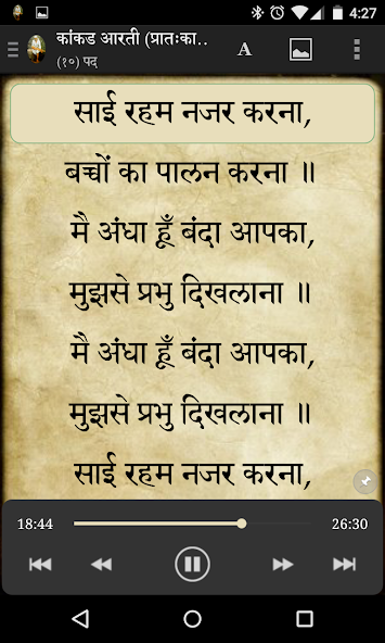 Ouça e canta ao longo de Shirdi Saibaba Aartis . Aarti é cantado na língua marathi (e alguma parte está em hindi). Letras disponíveis em Devanagari Script (Marathi/Hindi), Inglês, IAST e Itrans. Toque no ícone do Saibaba na barra de ação (superior esquerda) ou deslize para a direita da borda esquerda da tela para selecionar um Aarti diferente.
