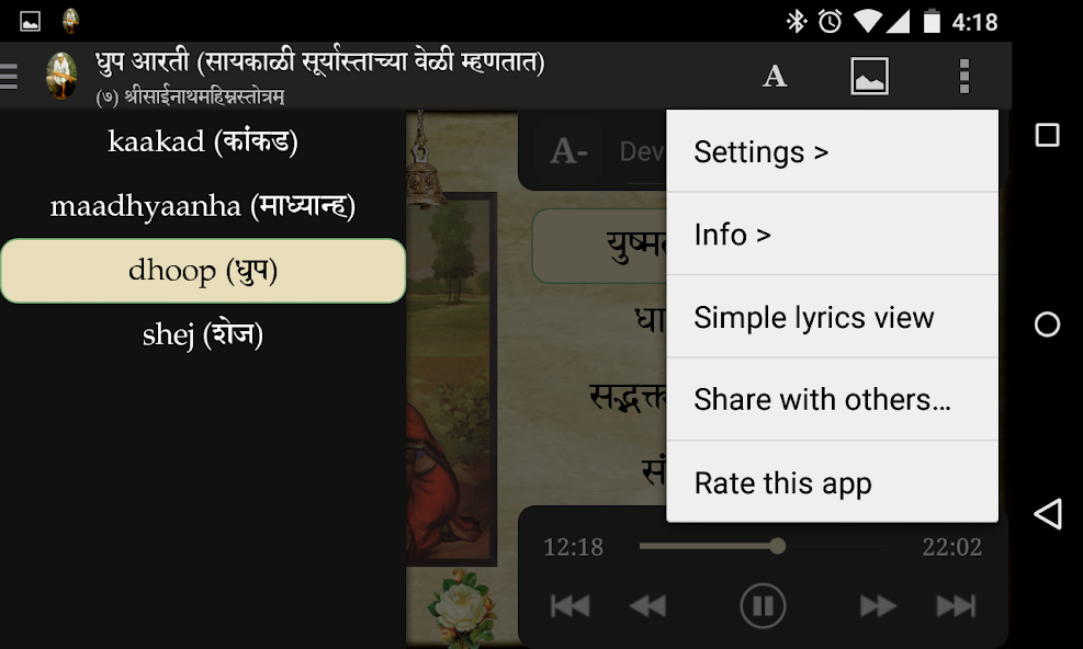 - Lyrics simples visualização para rolar manualmente. As letras também podem ser roladas manualmente na tela do jogador quando o Aarti é pausado.