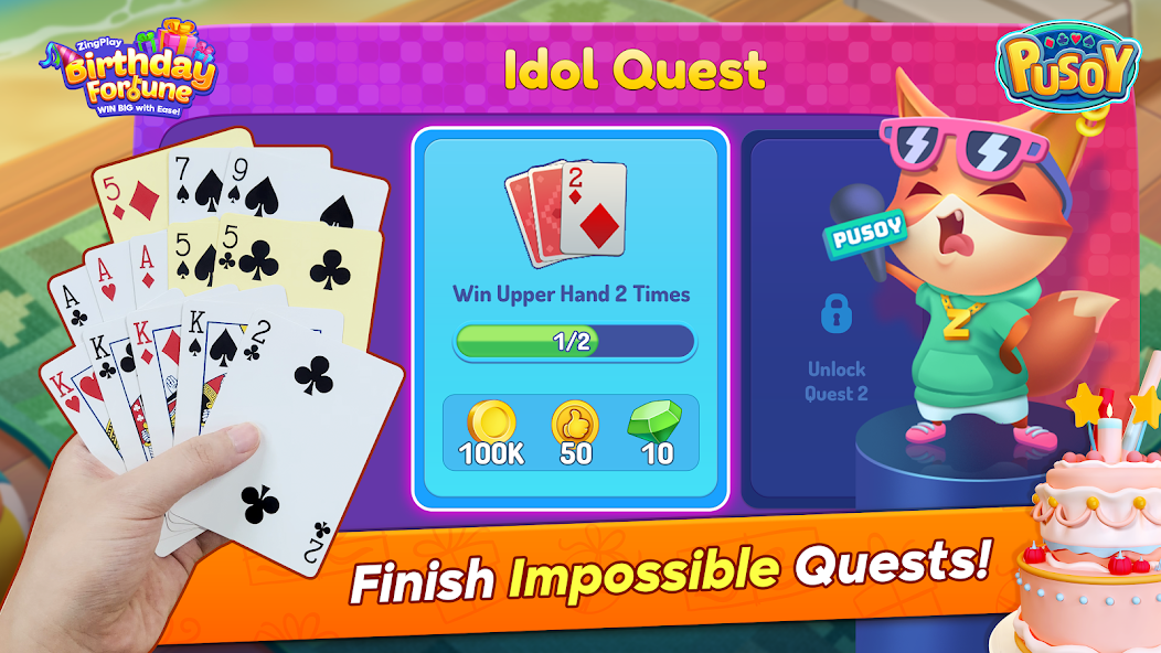 Advance your skills with the series of Idol Quests. Finish all of them, from the easiest one - play 1 match - to the hardest, Pusoy all of the opponents. Complete to get extra gold and keep on playing.