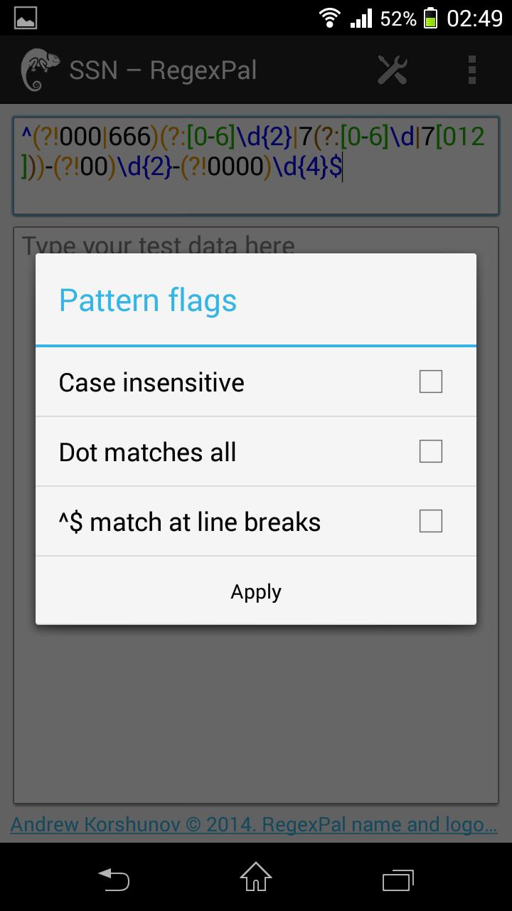 • Open source. https://bitbucket.org/andkorsh/RegexPal-android/