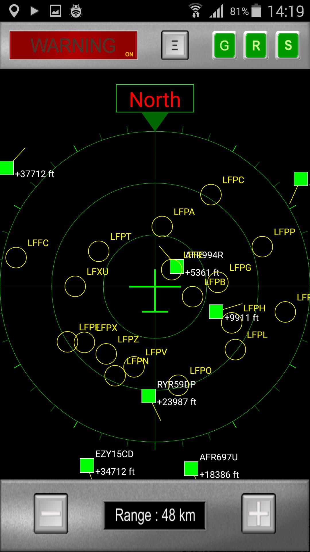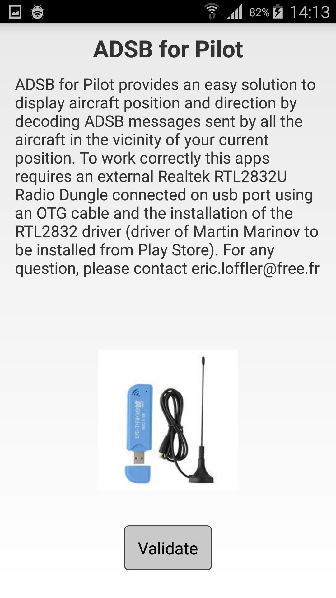 ADSB для Pilot предоставляет простое решение для отображения позиции и направления воздушного судна путем расшифровки сообщений ADSB, отправленных всем воздушным судном вблизи позиции пользовательского текущего. Для правильной работы, этим приложениям требуется внешний радио -ключ Realtek 2832U, подключенный к USB -порту с использованием кабеля OTG, и установку «Driver RTL2832U» от Martin Marinov (для установки из магазина Play).