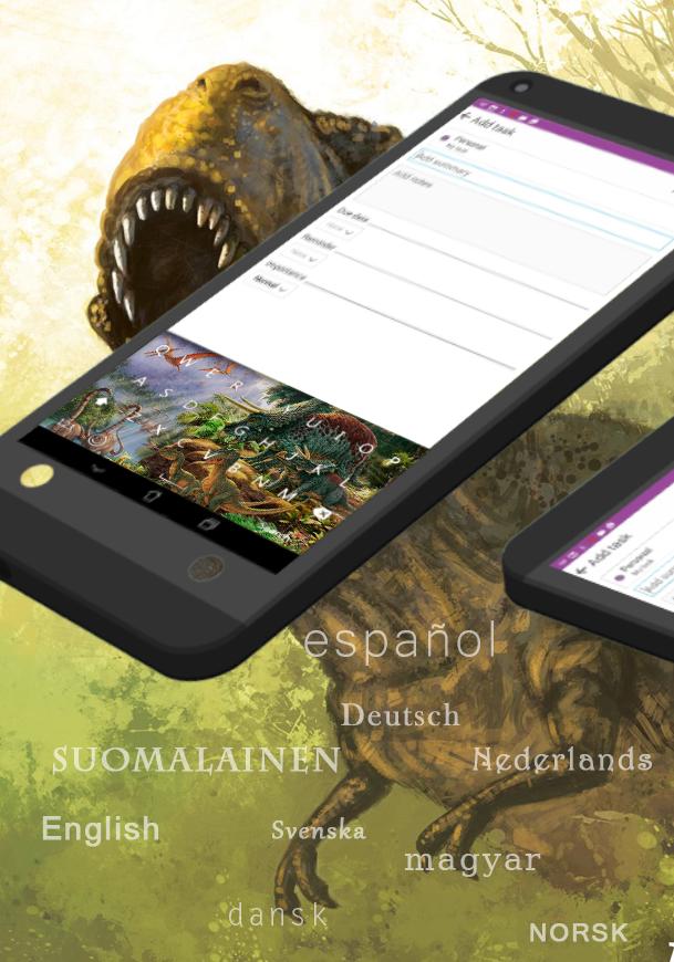 GO Keyboard Jurassic Dinosaurs обладает поддержкой макета для Qwerty, Azercy, Qwertz, даже DVORAK или Colemak и поддерживает несколько языков с 12 встроенными языками: английским, испанским, французским, немецким, португальским, датским, голландским, финским, венгерским, итальянским, норвежским и шведным. Если вы хотите добавить какие-либо другие языки, вы можете проинформировать нашу команду поддержки по электронной почте.