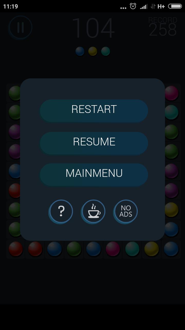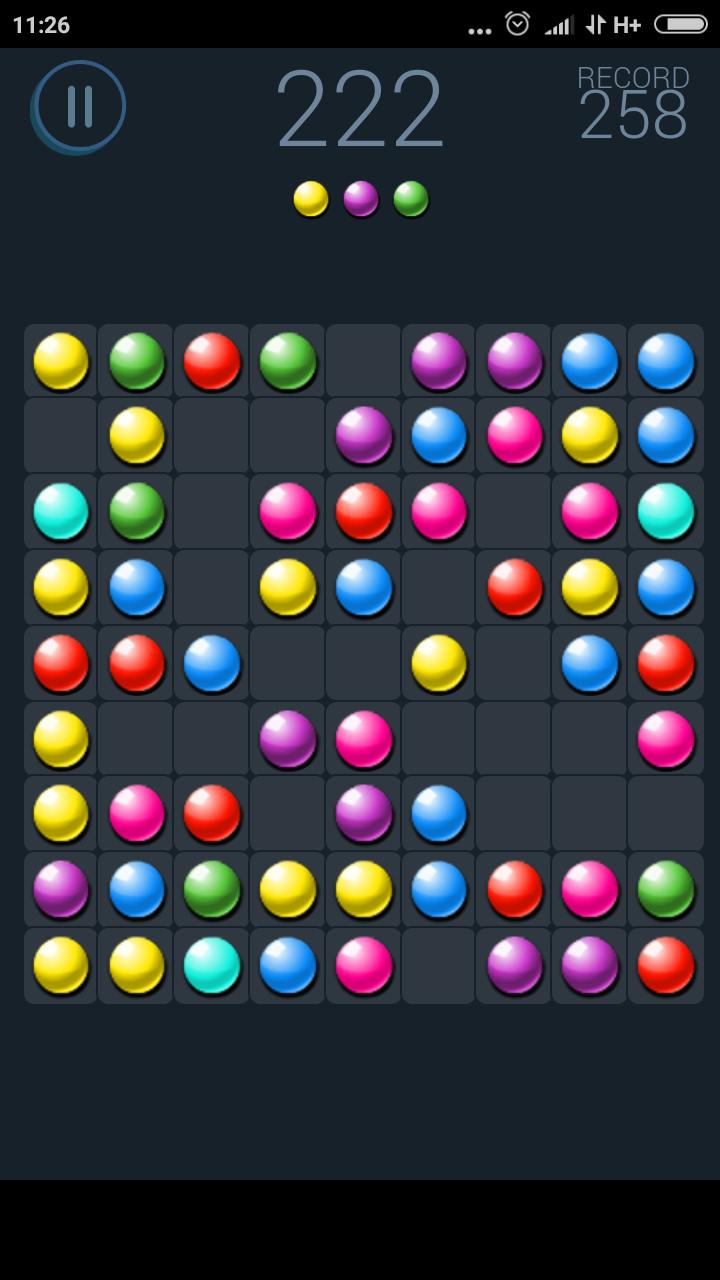 Эта стратегическая игра заставит вас думать и концентрироваться часами, если вы примете вызов. Он начинается с квадратной доски 9 на 9. Игра случайным образом помещает три цвета на игровой доске на каждом раунде, вы должны стратегически выбирать один мяч (нажмите на мяч) и переместить его в самое удобное место (нажмите на Target Square).