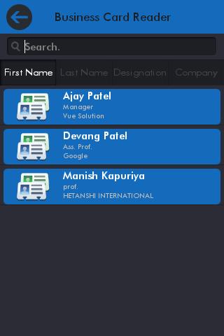 Vue Business Card Reader Catchte Image через камеру или с SD -карты и сканирует его для контактных данных. Он сканирует контактный номер, название, название компании, обозначение, электронную почту и веб -сайт с захваченного изображения автоматически и позволяет сохранять или редактировать отсканированные данные.