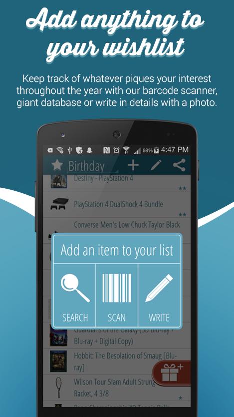 Не требуется входа в систему или реестр, все, что вам нужно для начала, - это загрузить из Google Play. Есть несколько устройств? Не проблема, застройщик youwish wiselist автоматически синхронизирует ваши списки и подарки между всеми устройствами Android, которые устанавливают Youwish. Добавьте подарок в свой список пожеланий на день рождения со своего телефона и посмотрите на свой планшет. Создайте свадебный реестр на своем планшете, сканируйте и найдите все подарки, которые вы пожелаете, и наблюдайте, как реестр волшебным образом появляется на вашем телефоне.