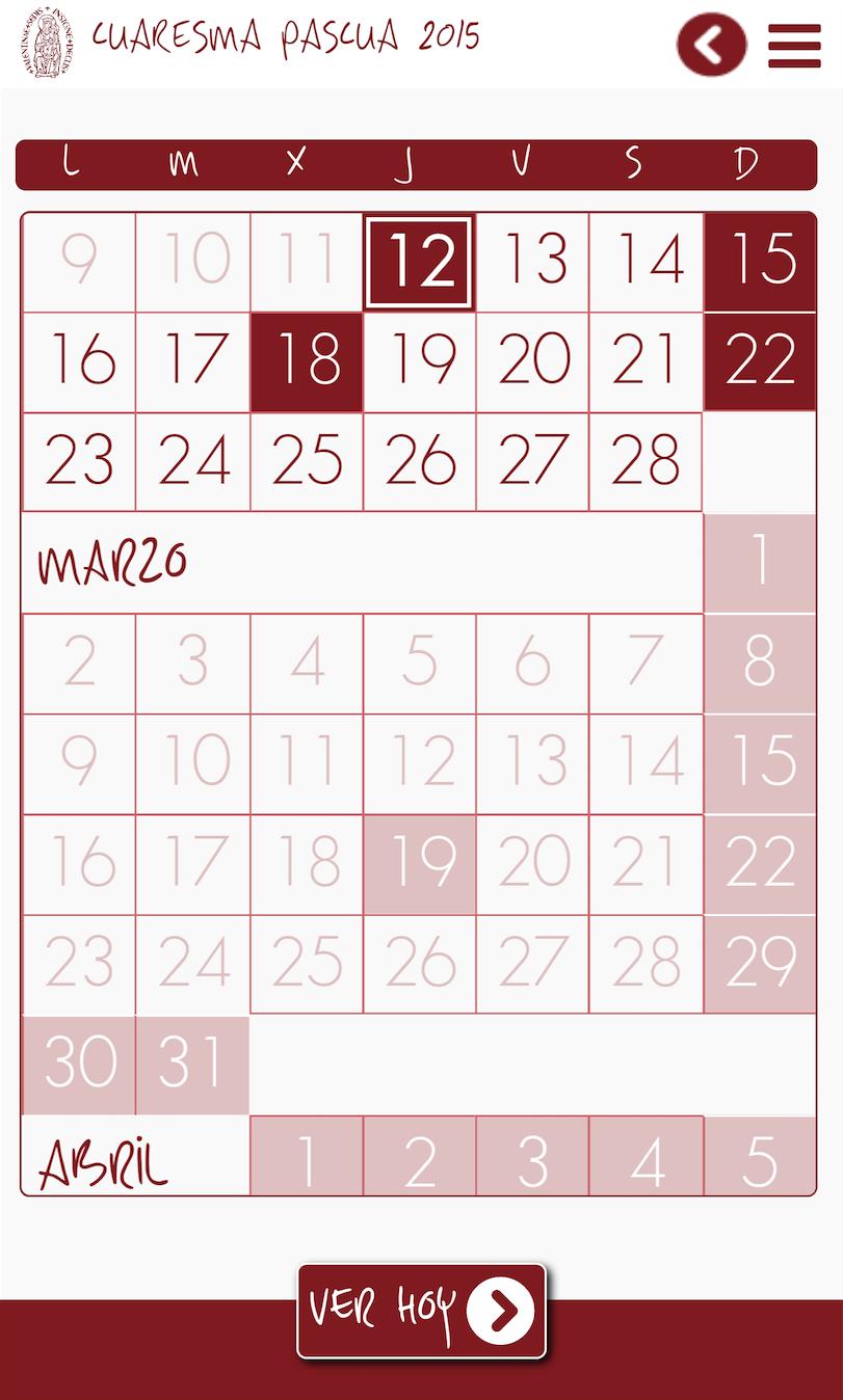 แอปพลิเคชันการเข้าพรรษาอีสเตอร์ช่วยให้การตรวจสอบประจำวันของการเข้าพรรษาและเวลาอีสเตอร์และวันที่สำคัญที่สุดของสัปดาห์ศักดิ์สิทธิ์เช่น Ash Wednesday, Domingo de Ramos, El Triduo Sacro, Domingo de Resurreción, Fiesta de la Divina Misericordia และวันอาทิตย์ของ Pentecost (10 พฤษภาคม) และสวรรค์ของพระเจ้า (17 พฤษภาคม)