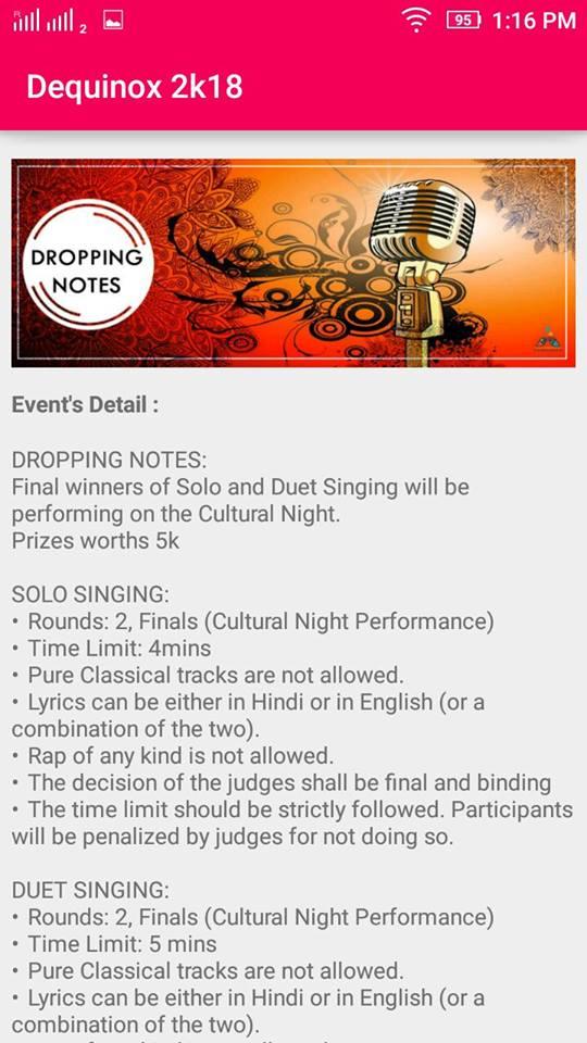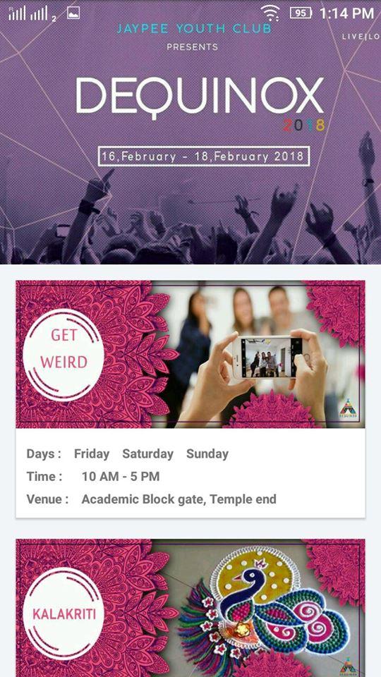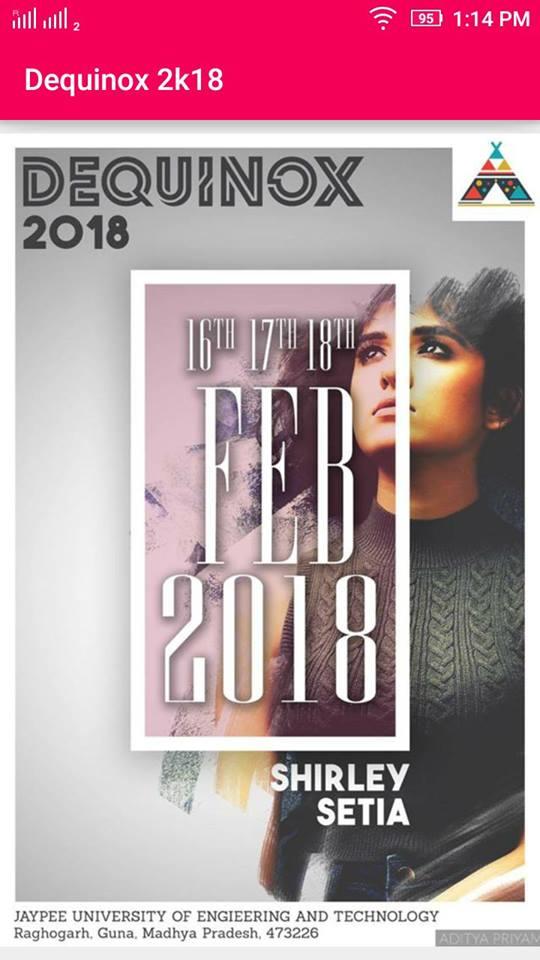 Dequinox 2018 เทศกาลวัฒนธรรมของ Juet Guna มีชื่อเสียงอย่างกว้างขวางว่าเป็นเทศกาลที่ใหญ่ที่สุดในภาคกลางของอินเดีย ด้วยบัญชีรายชื่อการมีส่วนร่วมที่มีมากกว่า 1 ร้อยวิทยาลัยทั่วทั้งกลุ่มวิชาการของอินเดีย Dequinox เป็นความหมายอันรุ่งโรจน์ของอุดมคติของนวัตกรรมความคิดและความมุ่งมั่นที่จะบรรลุความสำเร็จสูงและเป็นแพลตฟอร์มที่เป็นปรากฎการณ์ในการเลี้ยงดู