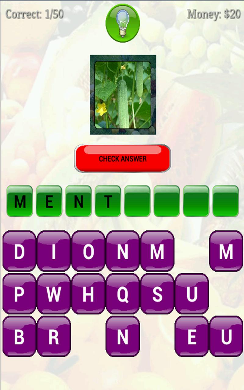 เดาชื่อของผลไม้เป็นเกมที่คาดเดาชื่อของผลไม้ตามภาพ เกมนี้เล่นง่ายมากโดยการเลือกจดหมายทุกฉบับที่จะถูกพันเป็นชื่อผลไม้ เกมนี้สามารถเพิ่มข้อมูลเชิงลึกและความรู้เกี่ยวกับชื่อผลไม้