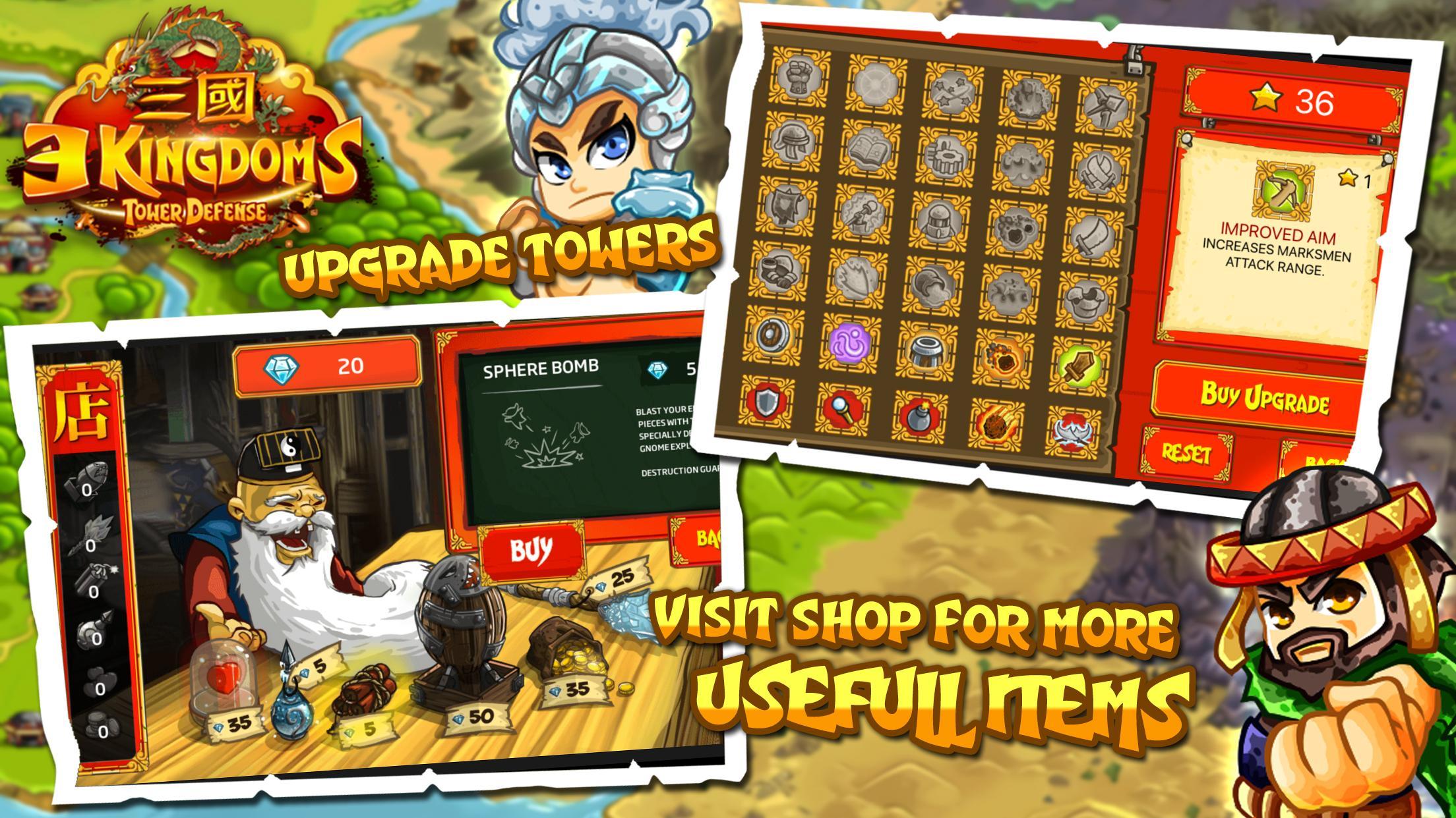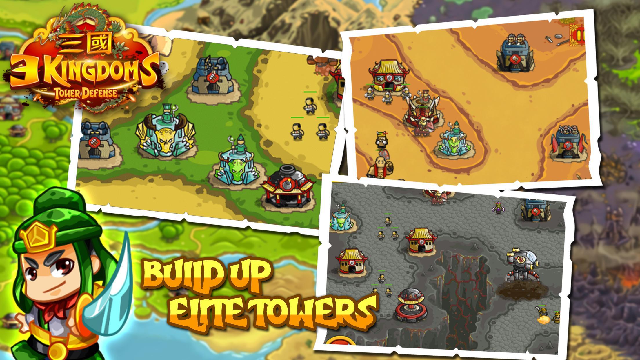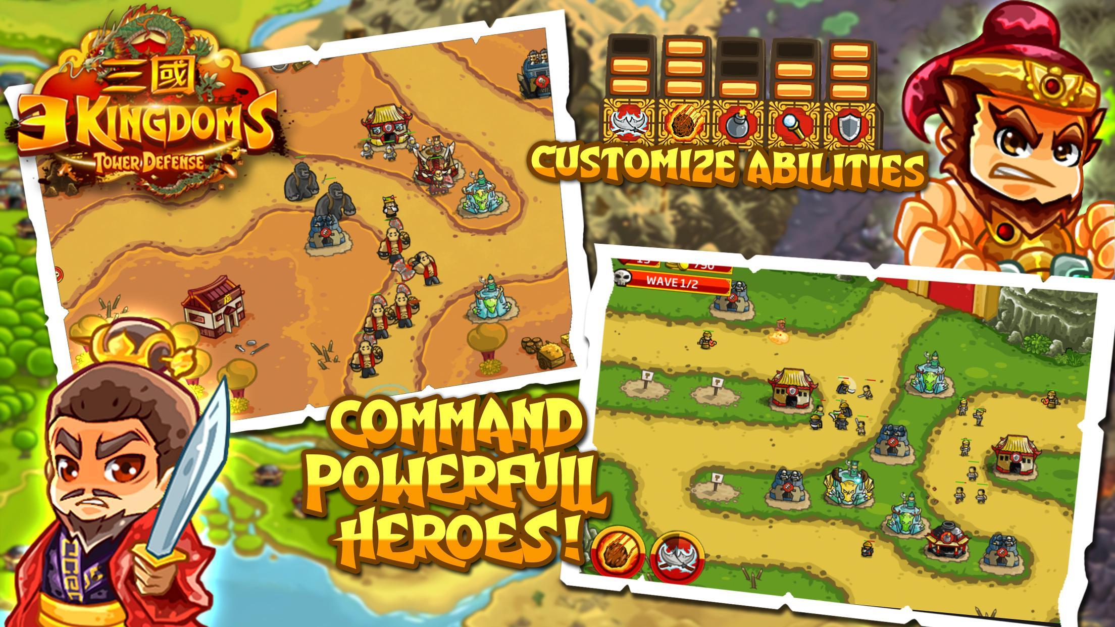 เตรียมใช้กลยุทธ์การป้องกันด้วยหอคอยที่คุณสามารถอัพเกรดและอาวุธพิเศษได้ ปกป้องอาณาจักรของคุณจากฝูงผ้าโพกหัวสีเหลือง พ่อมดผู้ชั่วร้าย โจร กบฏ กองกำลังเชียง และอีกหลายสิ่งหลายอย่างที่ต้องเอาชนะ! การต่อสู้ได้เกิดขึ้นในดินแดนทั่วจีน และเราต้องการฮีโร่เช่นคุณเพื่อเป็นตำนานในโลกสามก๊ก!