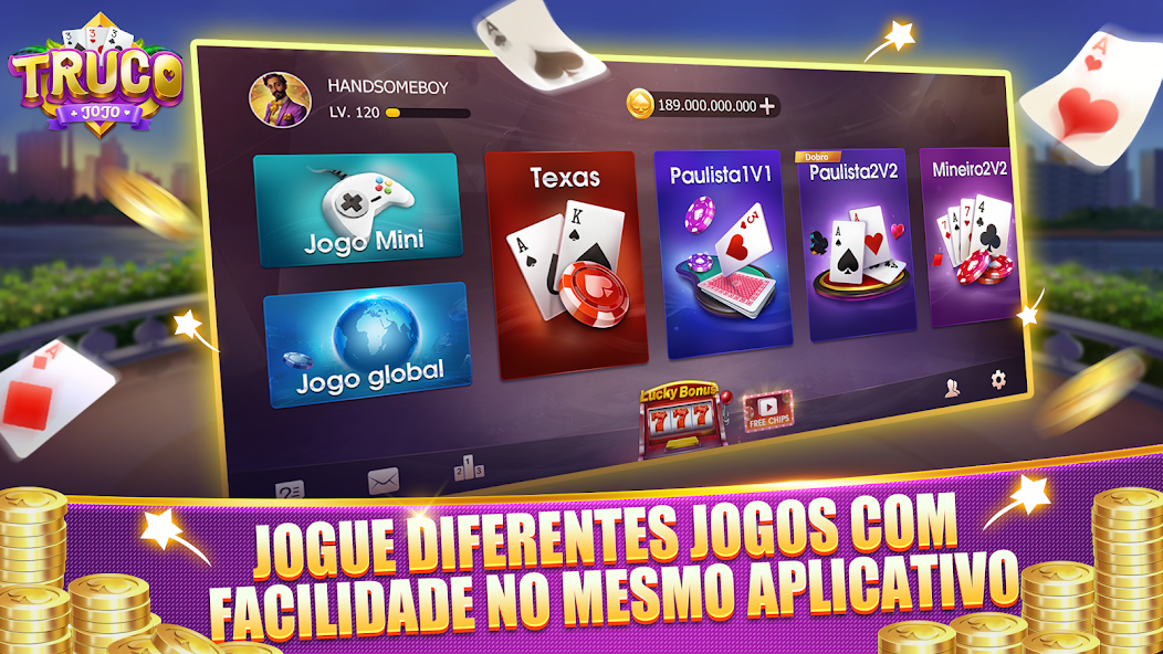 You can play Truco, Texas, Crash and other online games with your friends.