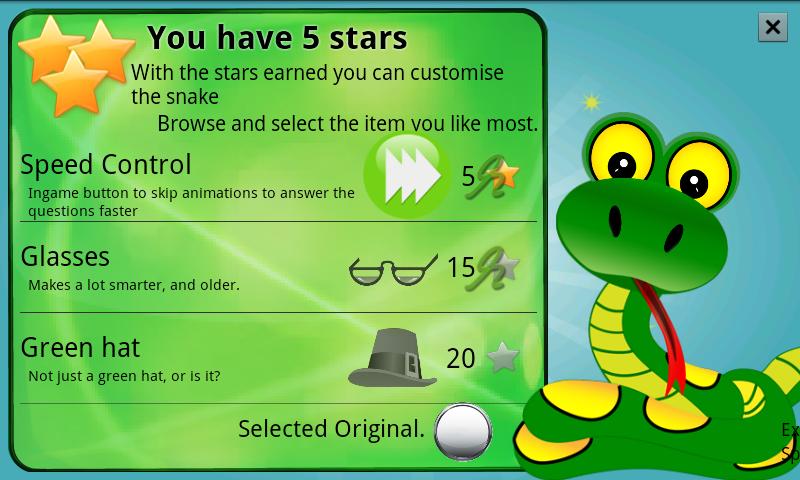 游戏的目的是玩所有的蛇段。每个细分市场都有数学分段(类似闪存卡的戏剧,遵循特定的学习路径,并且随着进步而变得更具挑战性。获得1到3颗星的优秀比赛。点击蛇头以检查您可以用来做什么
