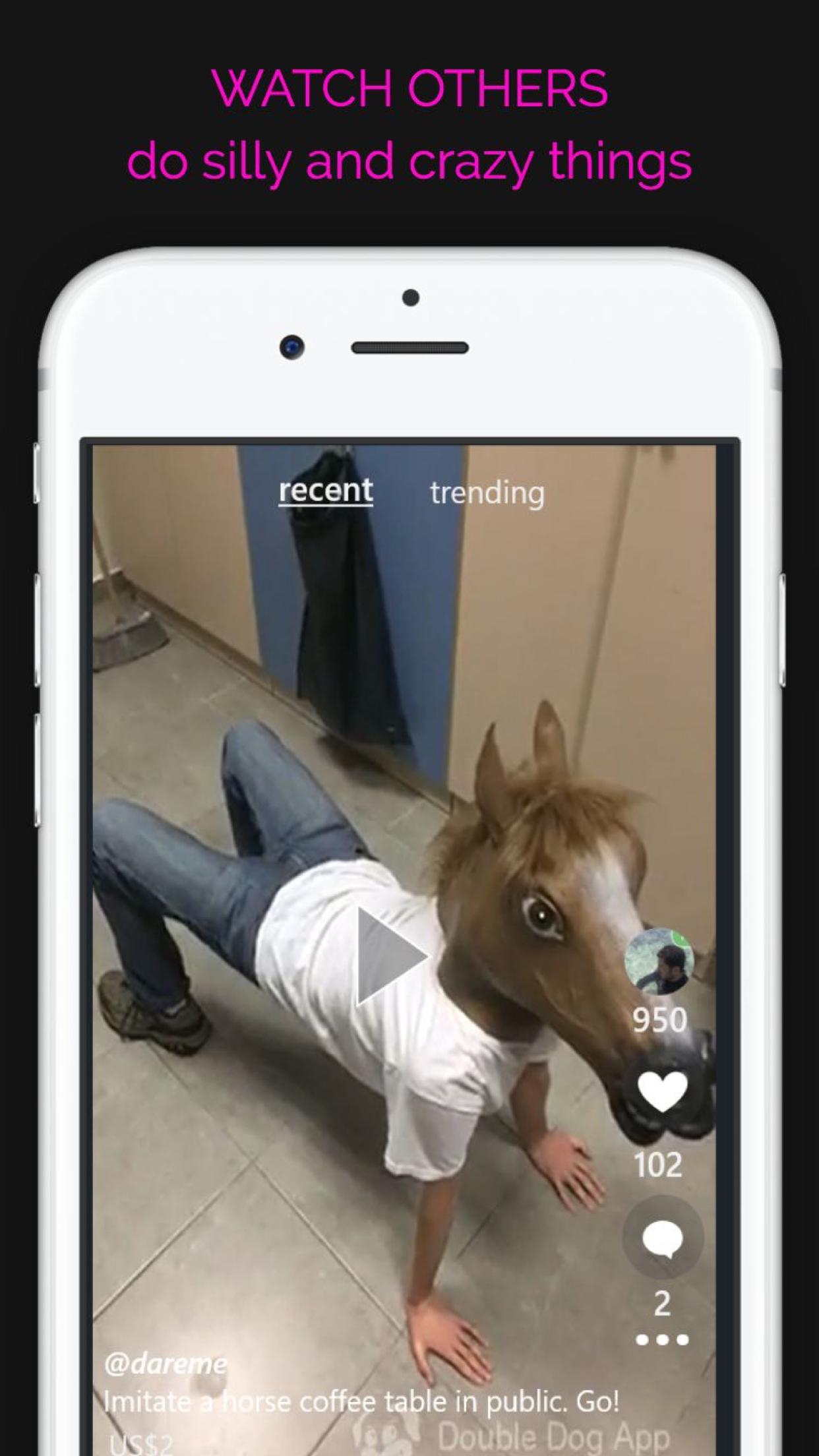 Double Dog is a dare app that you can dare anyone you want. Complete dares by submitting video proof, share your dare videos and watch funny dares live. A dare is a great way to meet new people!