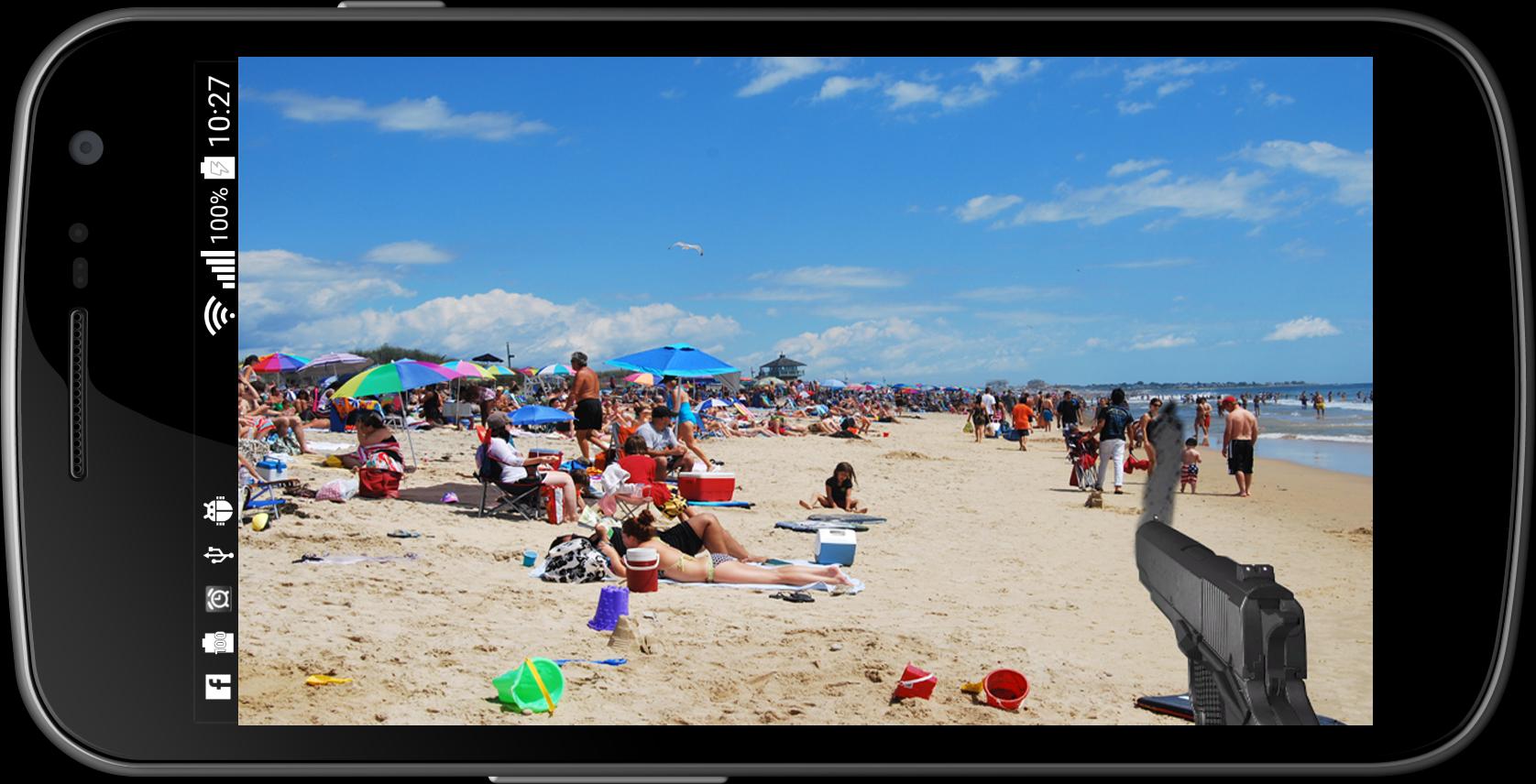 该应用程序将使用您的相机预览并模拟3D枪摄像机游戏,您可以在其中拍摄真实的目标。屏幕看起来像是一个自我射击游戏界面。