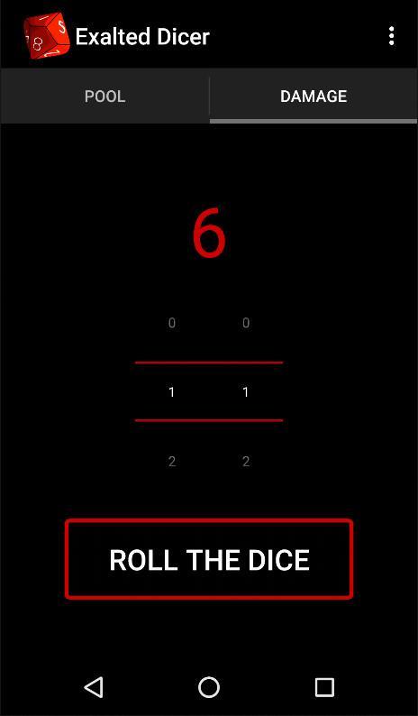 根据崇高的规则, Exalted Dicer可用于滚动池和1个最多99个骰子的损坏值。这可以通过按下按钮或摇动智能手机来完成。之后,成功的数量显示在泳池拾取器上方。