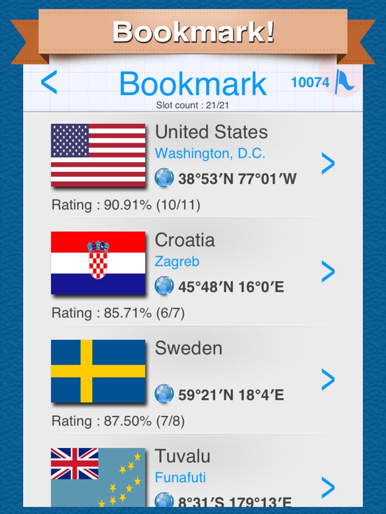 - 您可能知道每个国家信息。而且,您还可以从书签中知道正确的答案率。