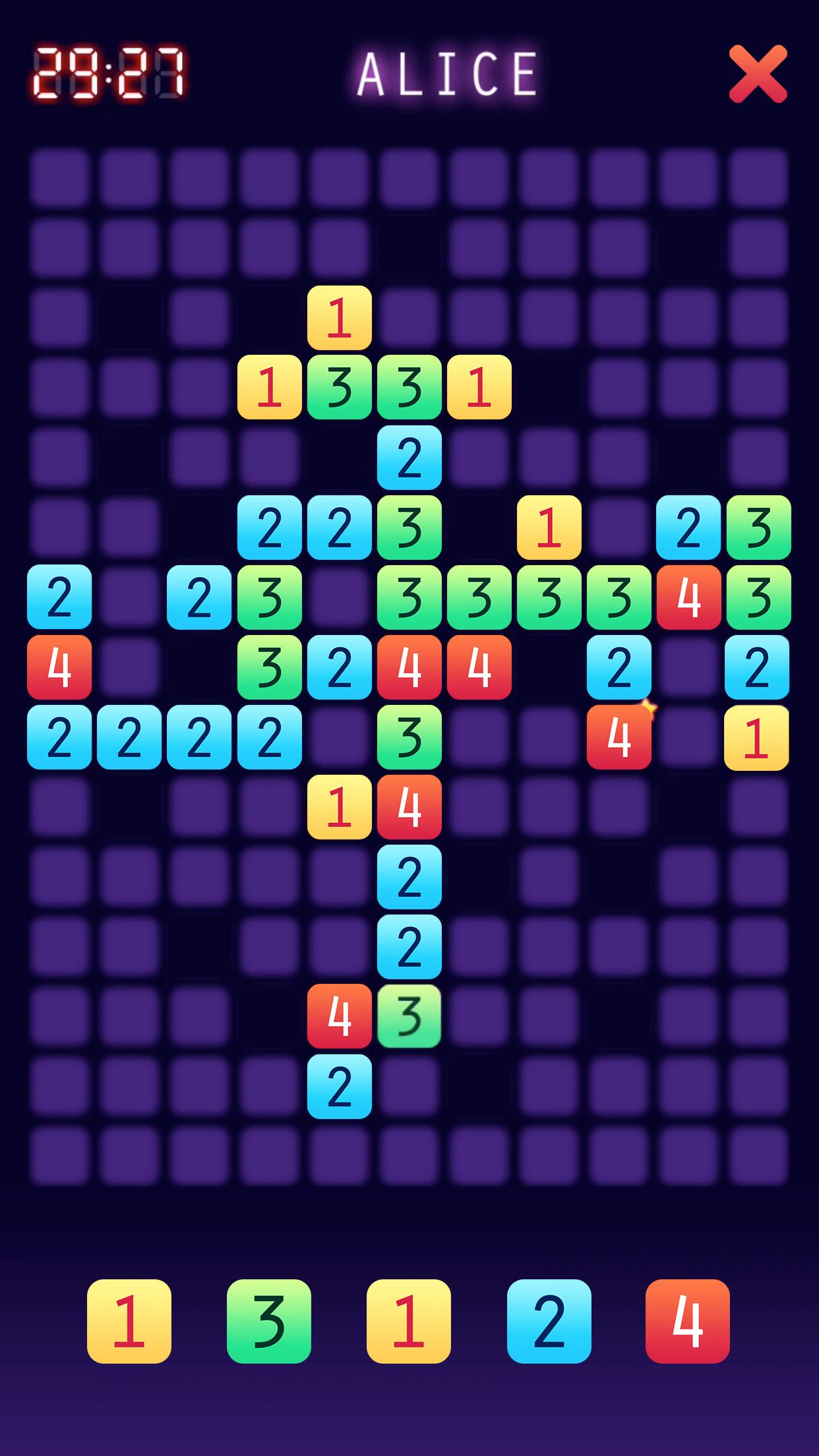 从一个有145个正方形的木板开始,中间有20个黑洞和第4个。您可以使用五个随机作品,编号为1到4,告诉您可以连接到另一个零件的侧面。轮到您将零件与其他碎片的连接次数合适的位置。您有30秒的行动。每个游戏都被随机的新作品所取代。将最后可能的作品放在董事会上获胜。