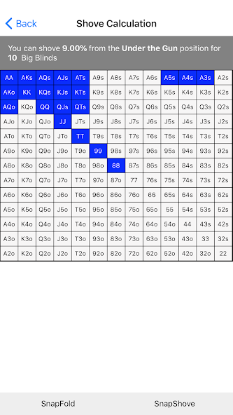 • SnapShove Pro提供更精确的计算,并提供更广泛的选项,用于玩家数量,Antes和Big Blind增量