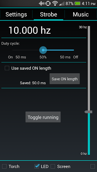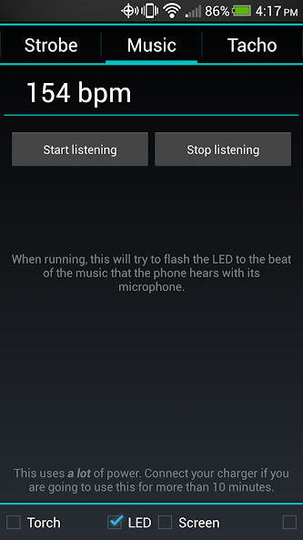 该应用程序中的最新功能是它可以闪到音乐节拍的能力。这对聚会很棒,因为频闪灯使音乐更有趣!