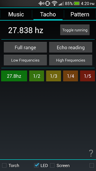 新的音频转速表功能使您的手机可以收听重复的声音并发现基本频率以及任何谐波。然后,使用一个简单的按钮按下,您可以以该频率闪烁LED并观察所有内容冻结。