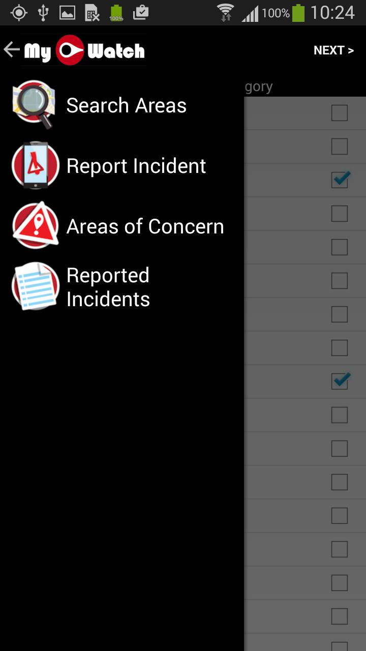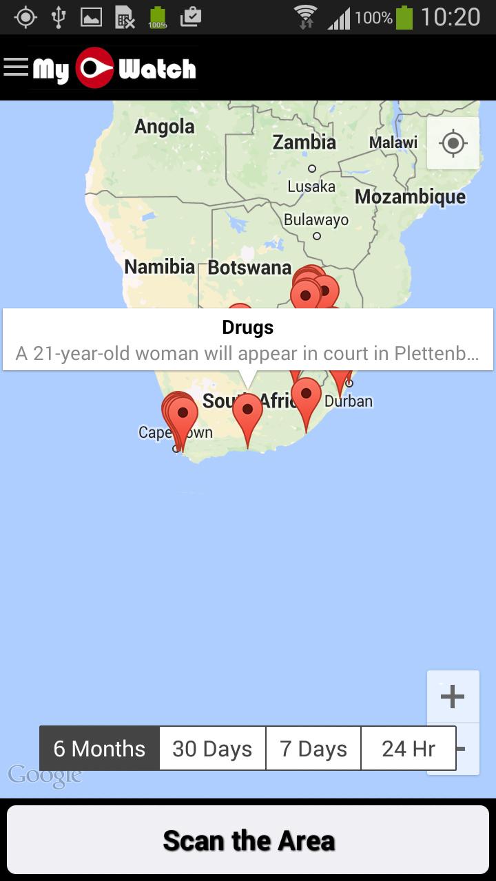 MyWatch允許用戶在其區域報告犯罪和事件,然後讓其他用戶搜索區域並查看這些犯罪的報告。